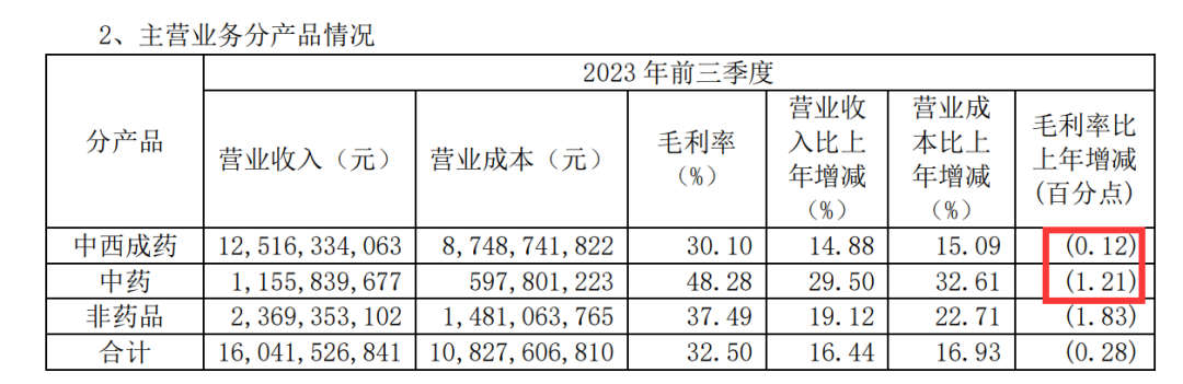 另一方面,老百姓中西成药(指成分中既有中药提取、又有明确的化学制剂的复方制剂)收入占比较高,2023年前三季度占比达到78%,而中西成药业务毛利率在公司所有业务中最低,因此对公司毛利率有一定的拉低。