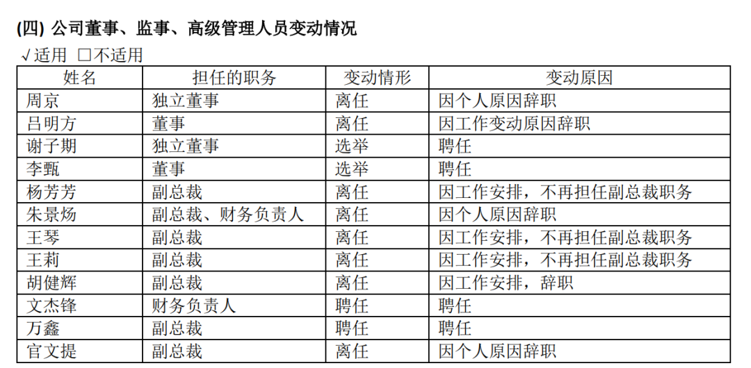 2023年3月,财务中心总监兼财务负责人文杰锋任期尚不满一年,因个人原因辞职。6月,公司副总裁王坤因个人身体原因辞职,任期不满三年。