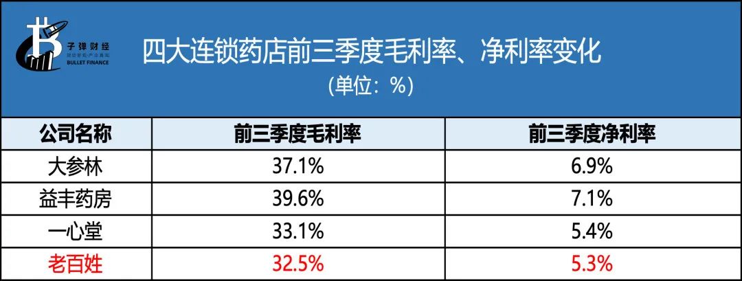 值得一提的是,前三季度,门店数量最多的老百姓,毛利率、净利率均低于同行。老百姓的毛利率为32.5%,净利率为5.32%。大参林、益丰药房、一心堂毛利率分别为37.05%、39.55%、33.13%,净利率分别为6.9%、7.1%、5.4%,均高于老百姓。