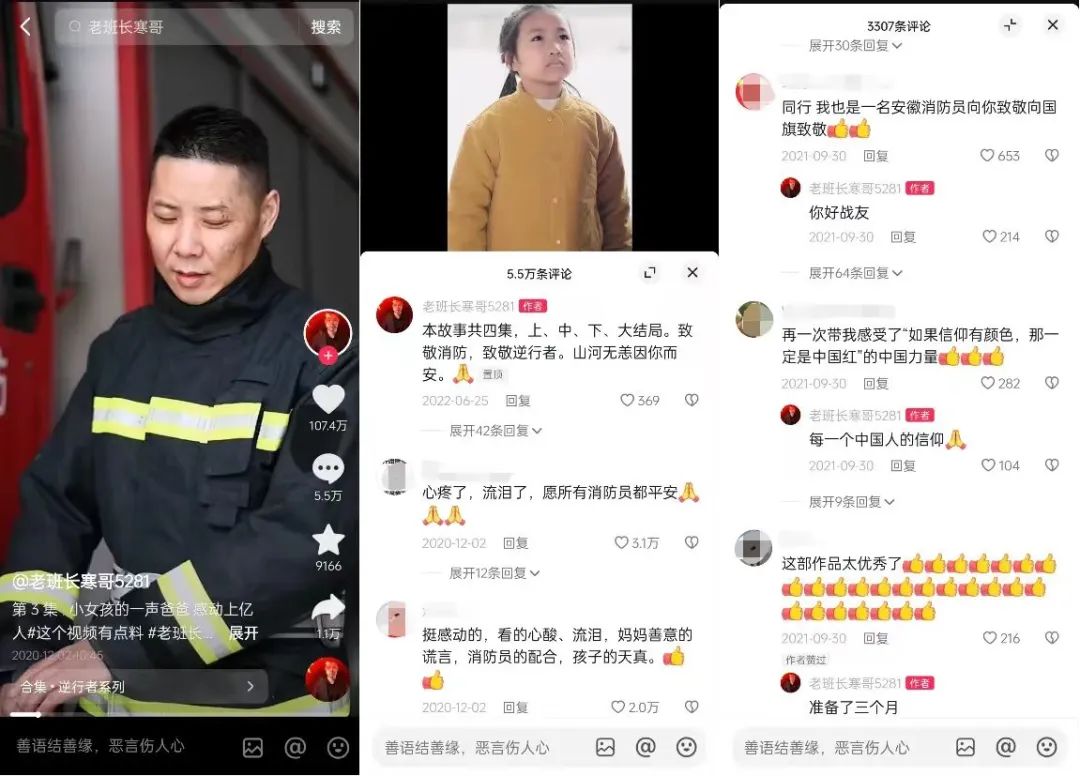抖音内的微短剧《承诺无声》则将消防员题材与家庭情感题材叠加。这部讲述消防员张子寒照顾牺牲战友张大伟妻儿的故事改编自真实经历,不仅呈现了消防员战士们舍小家为大家的勇敢、战士之间互相扶持的友情,也体现了在日常生活中他们面对爱人和孩子的“不得已缺位”,立体的描述和生动的消防员细节也收获了无数观众的眼泪。