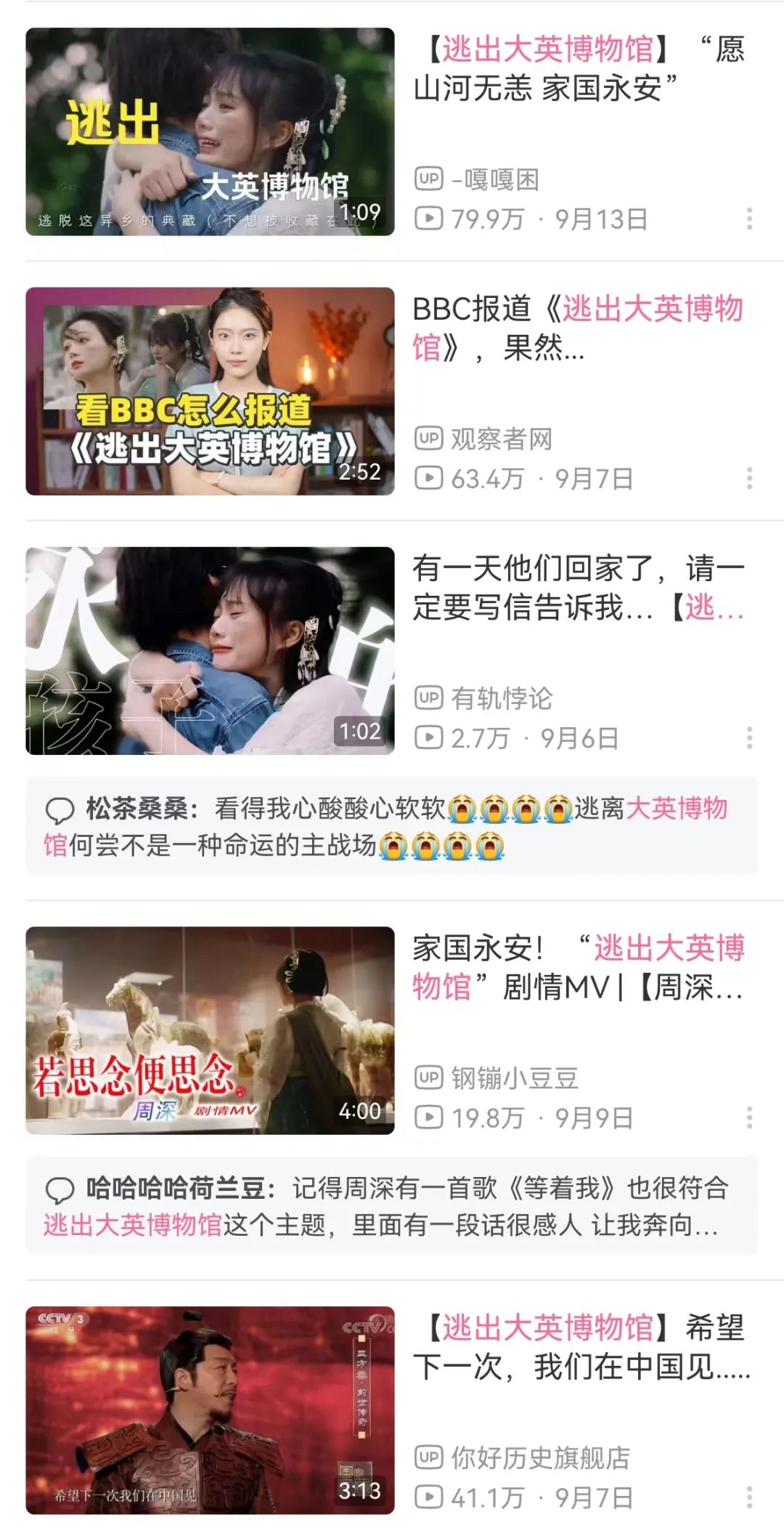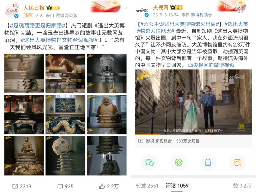 典型如今年的爆款短剧作品《逃出大英博物馆》,便是在短剧用户熟悉的古风甜宠内容中,加入了浓烈的家国情怀,结合对“文物回归”议题的关注,通过文物拟人的方式,将短剧的情感从小情变为大爱,也成功实现了全网走红,收获了人民日报、人民网、央视等多家官媒的称赞。