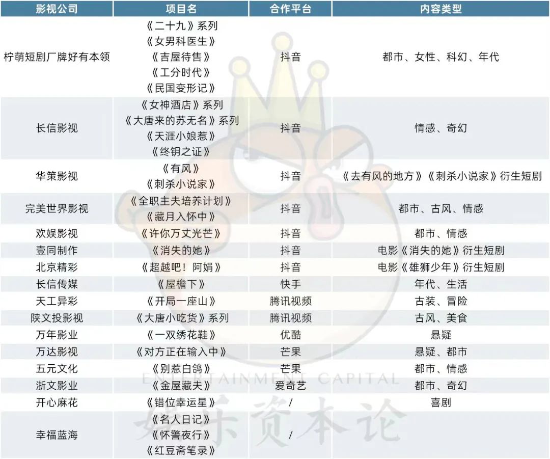 影视公司微短剧项目不完全统计(根据各平台片单及公开信息整理)