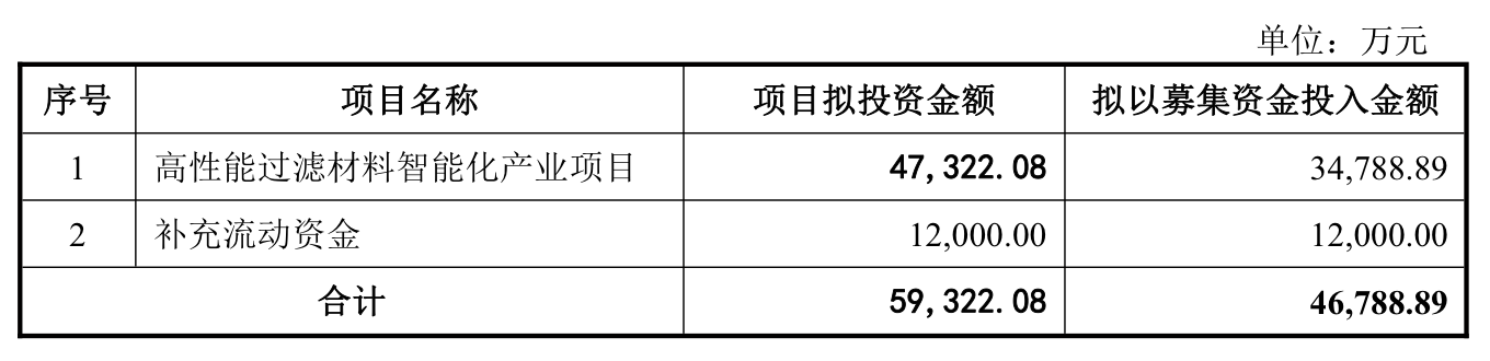 “高性能过滤材料智能化产业项目”的拟建设地点位于浙江省天台县“天台数字经济产业园”,项目将通过购置土地、新建生产厂房及配套设施,引进先进生产设备进行实施。项目建设完成后,公司将新增年产919万平方米高性能过滤材料的生产能力。