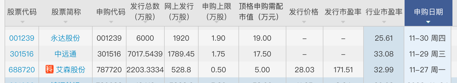 11月27日周一,科创板公司艾森股份(688720.SH)出场,其申购上限0.5万股,顶格申购需配市值5万元,其发行价格28.03元,发行市盈率171.51倍,行业市盈率32.99倍。