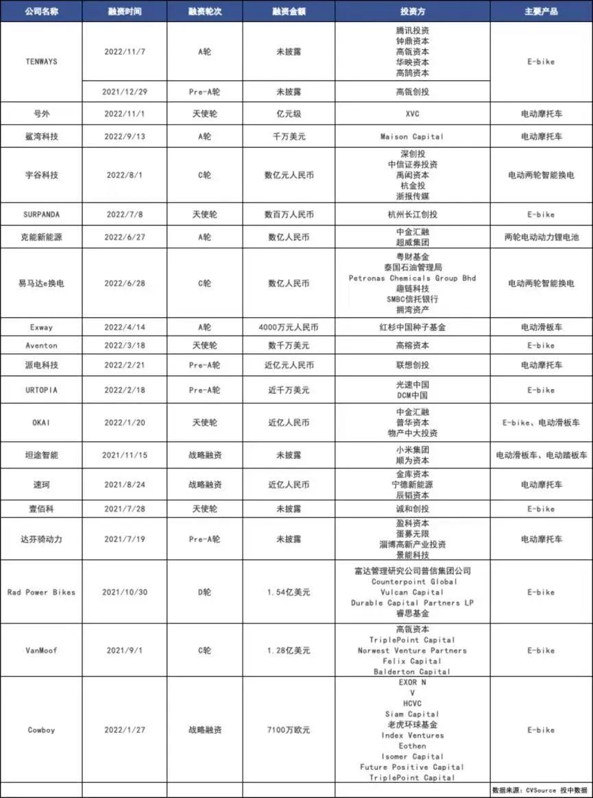 据CVSource数据显示,2021年7月-2022年11月的一年半时间中,超20家两轮电动车企业获得融资。其中,一家叫做TENWAYS公司,获得了阿里巴巴、腾讯、高瓴资本的融资,最新一轮融资已高达3亿。
