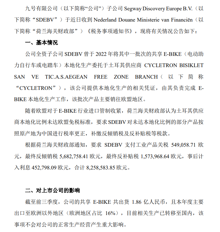 本次补税所涉业务,是九号公司的共享E-Bike业务(电动助力自行车或电踏车),荷兰监管方面要求SDEBV对未达本地化比例的部分共享E-Bike产品按照原产地为中国进行税率更正,补缴反倾销税及反补贴税等税款。
