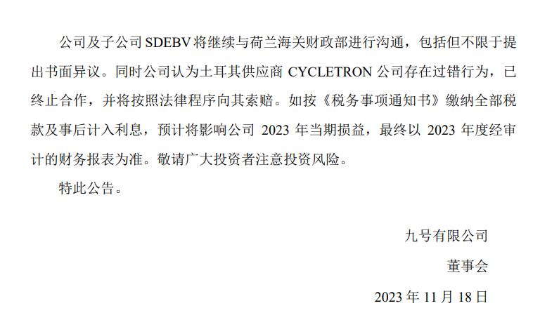 这份公告还称,此次税款补缴涉及的E-BIKE土耳其供应商CYCLETRON,本地化比例未达欧盟免税标准。九号公司表示该事项不会对公司的正常生产经营产生重大影响,已终止与CYCLETRON的合作,并将按照法律程序向其索赔。