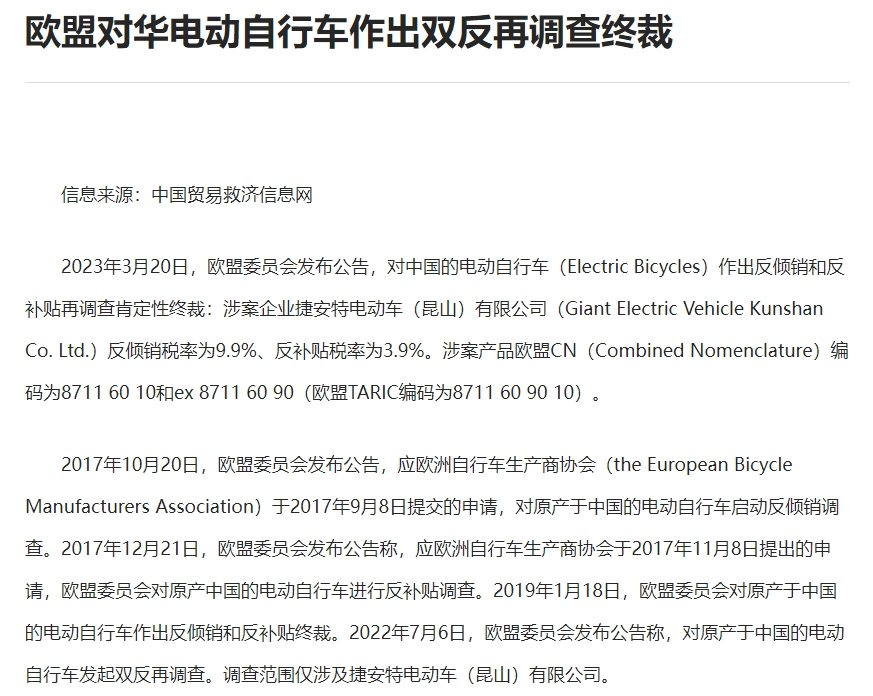 今年3月,另一家中国企业——捷安特电动车(昆山)有限公司,就被欧盟委员会作出反倾销和反补贴再调查肯定性终裁:反倾销税率为9.9%、反补贴税率为3.9%。