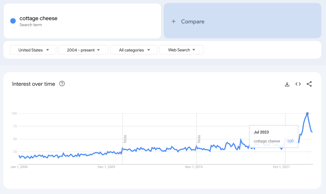数据显示,今年7月,Google上搜索“农家奶酪“的搜索指数达到了100,这是2004年以来农家奶酪搜索量的最高水平。