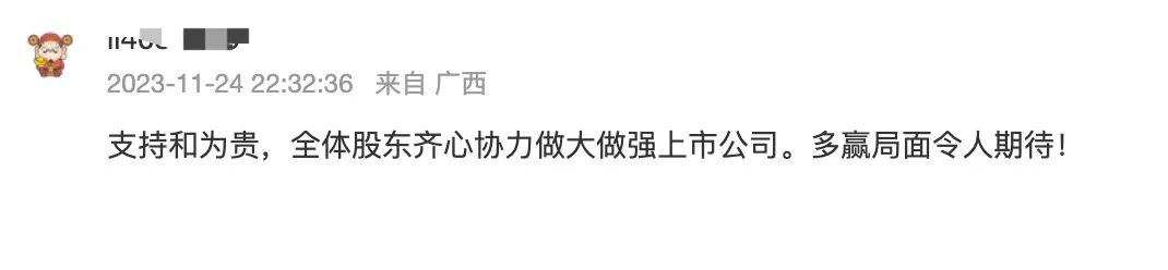 对于这次董事会变动,有投资者表示:“支持和为贵,全体股东齐心协力做大做强上市公司。多赢局面令人期待!”