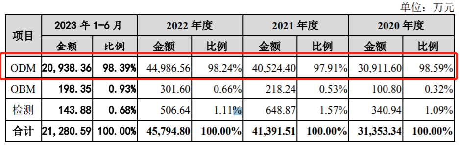 2020年-2023年上半年,芭薇股份ODM模式销售金额分别为3.09亿元、4.05亿元、4.5亿元和2.09亿元,占当期营业收入等比例分别为98.59%、97.91%、98.24%和98.39%。