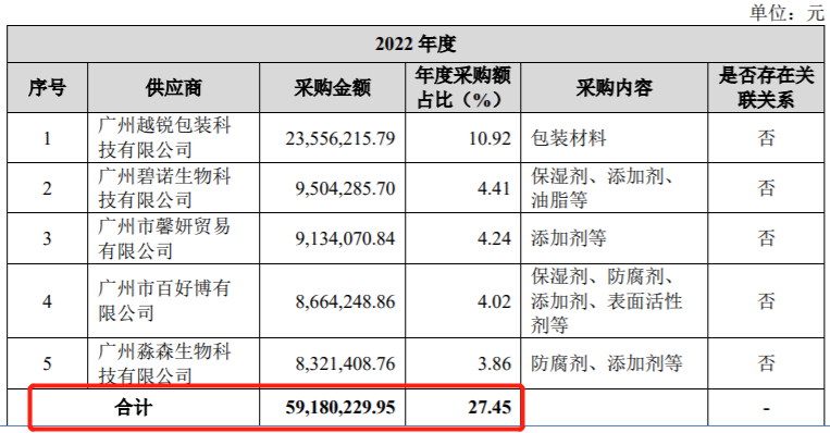与此同时,2022年,芭薇股份前五大供应商中还增加了两个“新面孔”——广州碧诺生物科技有限公司和广州市馨妍贸易有限公司。