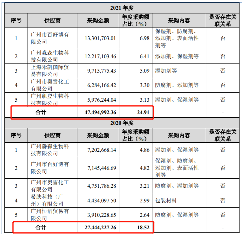 招股书显示,芭薇股份采购主要由包装材料及原材料所构成,原材料主要包括添加剂、保湿剂、表面活性剂、油脂等。