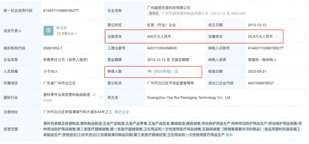 企查查显示,广州越锐包装科技有限公司成立于2012年,注册资本为500万元,实缴资金仅为28.8万元,参保人数仅为19人。