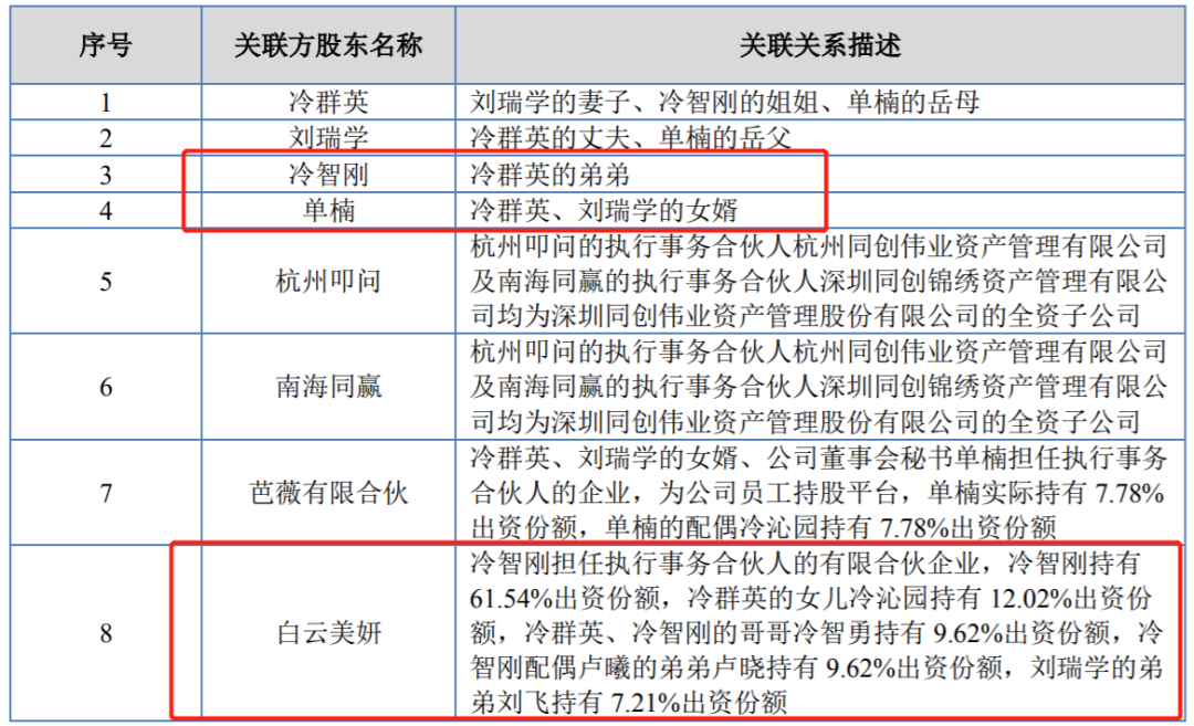不仅如此,白云美妍持有芭薇股份2.17%的股份。其中,冷沁园、冷智刚、冷群英哥哥冷智勇、冷智刚配偶的弟弟卢晓、刘瑞学弟弟刘飞均持有白云美妍的股份。