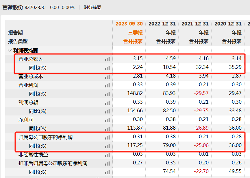 2020年-2023年前三季度,芭薇股份的营业收入分别为3.14亿元、4.16亿元、4.59亿元和3.15亿元,同期归母净利润分别为2835.67万元、2125.13万元、3083.95万元和3080.73万元。