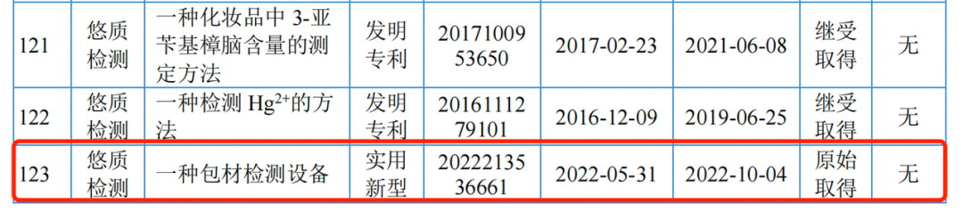 其中,悠质检测与检测业务相关的3项专利中,仅“一种包材检测设备”实用新型专利为原始取得,其余两项发明专利均是继受取得。