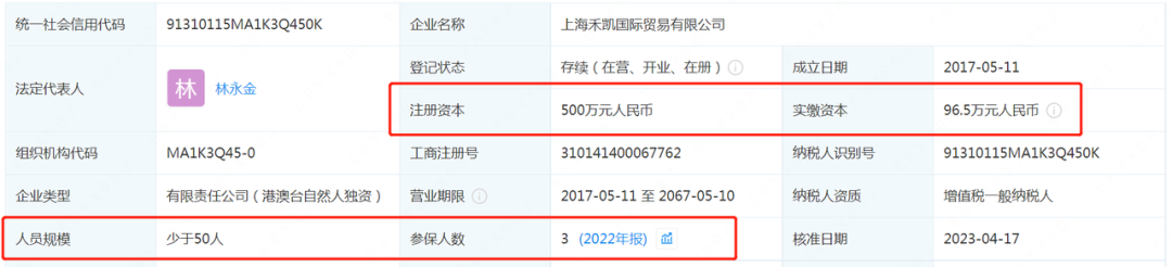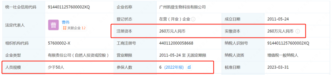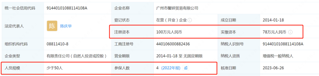 此外,2021年芭薇股份前五大供应商——上海禾凯国际贸易有限公司,实缴资本96.5万元,2022年参保人数3人;广州凯登生物科技有限公司实缴资本260万元,但2022年参保人数仅为6人。