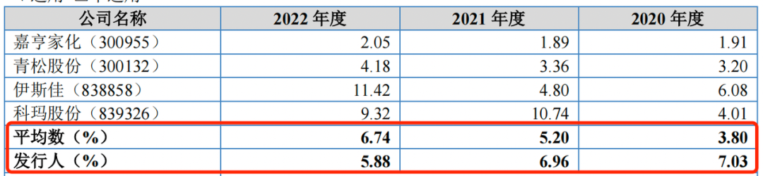 相比之下,同行可比公司的研发费用率却在不断走高。2020年-2022年,芭薇股份同行业可比公司的研发费用率平均值分别为3.80%、5.20%、6.74%,2022年,芭薇股份的研发费用率低于同行平均值。