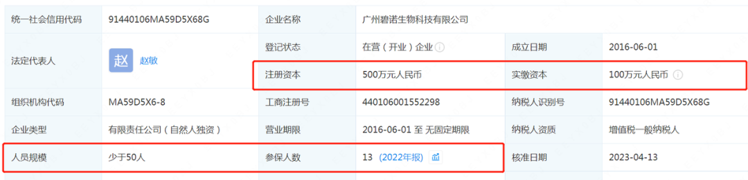 企查查显示,广州碧诺生物科技有限公司成立于2016年6月,注册资本500万元,实缴资本100万元。此外,2022年公司参保人数13人,却成为芭薇股份成为第二大供应商,采购金额950.43万元。