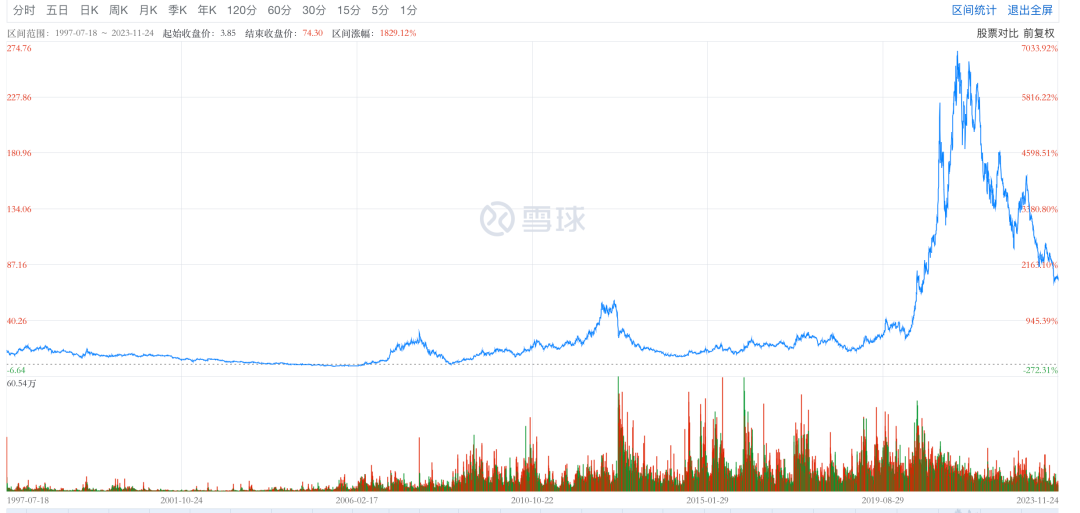 截至2023年三季度,建信中证饮料ETF的前十重仓股分别为五粮液、泸州老窖、贵州茅台、山西汾酒、洋河股份、古井贡酒、今世缘、青岛啤酒、舍得酒业以及重庆啤酒,和2020年1季度的持仓配置相比,除了持仓权重不一样之外,还缺少了酒鬼酒,新增了舍得酒业。据雪球数据显示,酒鬼酒自上市以来,在2021年的6月到12月期间,其股价处于顶峰阶段,之后开始下跌至今。