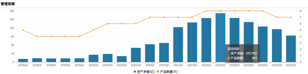 除了规模缩水之外,建信基金的权益类明星经理也开始“失色”了。任职12年+的老将陶灿创下了261.2%的回报率,但今年三季度陶灿的在管规模跌破百亿。据wind数据,三季度陶灿7只产品的在管规模累计为93.2亿,与其巅峰时期的171.71亿元规模相比,缩水了84.2%。