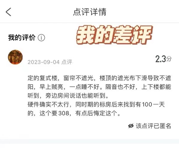由于经营的非标准化,民宿的货不对板、所见非所得是长久以来存在的问题。如今,对于好评的过度维护更是加重了这一问题,似乎只需要维护好评价,不需要对民宿设施和服务等实质性问题进行改善,依然可以吸引到大量客人。如果客人有意见产生差评,只需要花手段删除差评即可。这种治标不治本的解法在网红民宿中尤为常见。