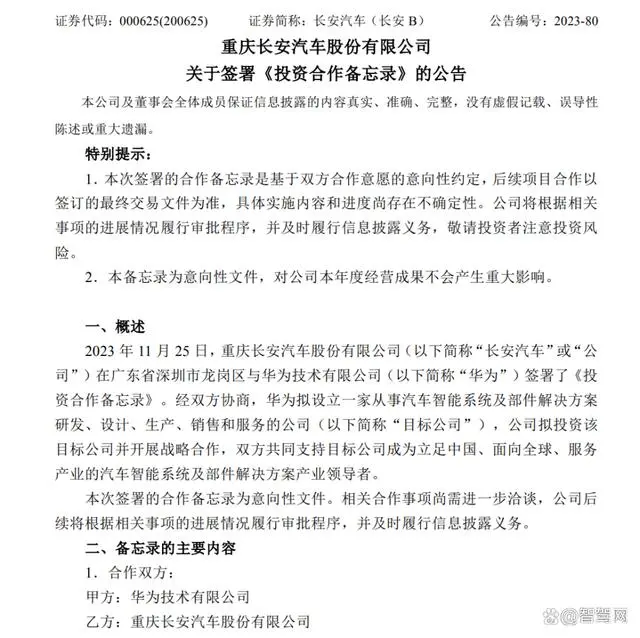 但同时长安汽车表示,本次签署的合作备忘录是基于双方合作意愿的意向性约定,具体出资比例、交易对价尚未最终确定,后续项目合作以签订的最终交易文件为准,具体实施内容和进度尚存在不确定性,包括项目终止的可能性。