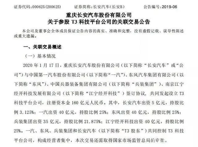 2020年1月17日晚,长安汽车发布公告称,当日,公司与中国第一汽车股份有限公司(以下简称“一汽”)、东风汽车集团有限公司(以下简称“东风”)、中国兵器装备集团有限公司(以下简称“兵装集团”)、南京江宁经开科技发展有限公司(以下简称“江宁经开科技”)签订协议,共同出资160亿元,发起设立T3科技平台公司。