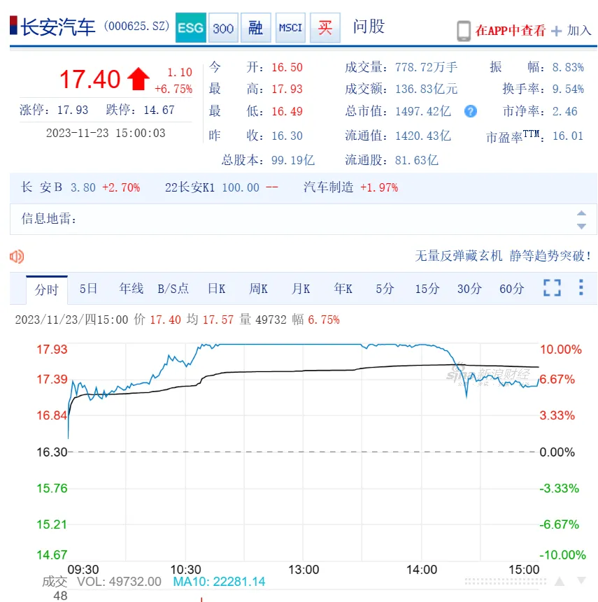 11月23日,长安汽车A股盘中一度快速拉升至涨停,不过最终报收于17.40元,上涨6.75%。(详见《别担心,华为绝不会把车BU当包袱一样甩掉》)