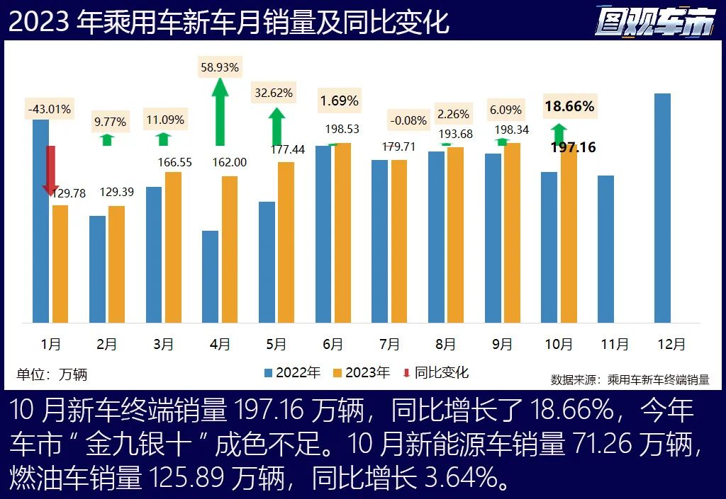 根据乘用车终端销量数据,10月国内新车销量197.16万辆,同比增长18.66%,环比微跌0.6%,1-10月累计新车销量1732.57万辆,同比增长5.08%,全年预期销量2200万辆以上。10月燃油车销量125.89万辆,同比增长了3.64%,环比则下降2.32%,新能源车销量71.26万辆,依然保持增长势头。