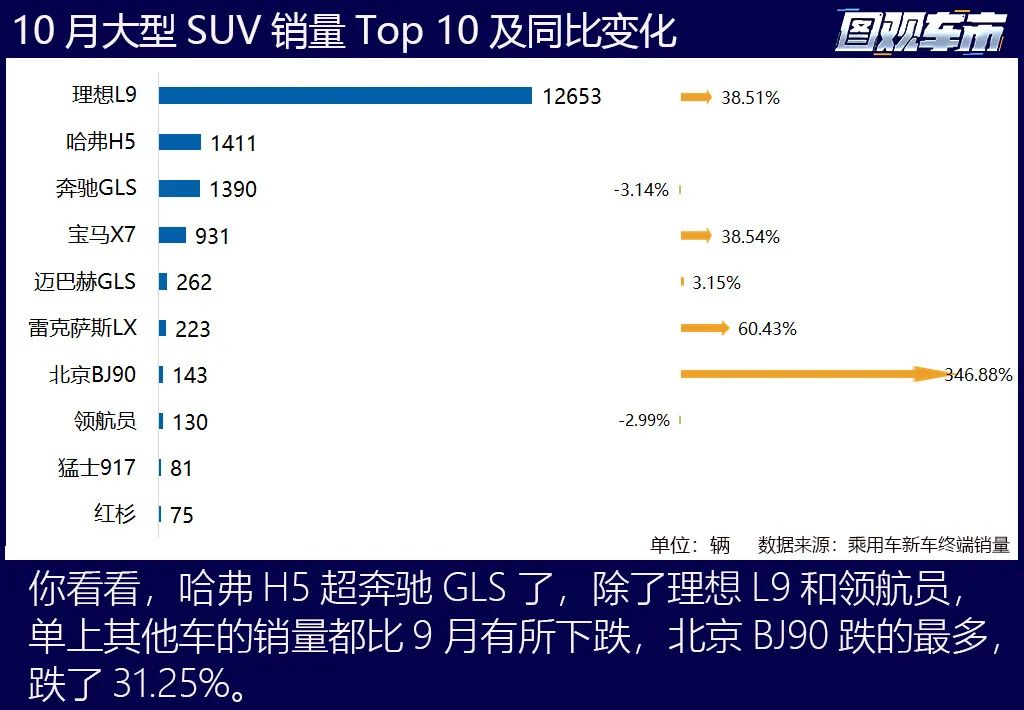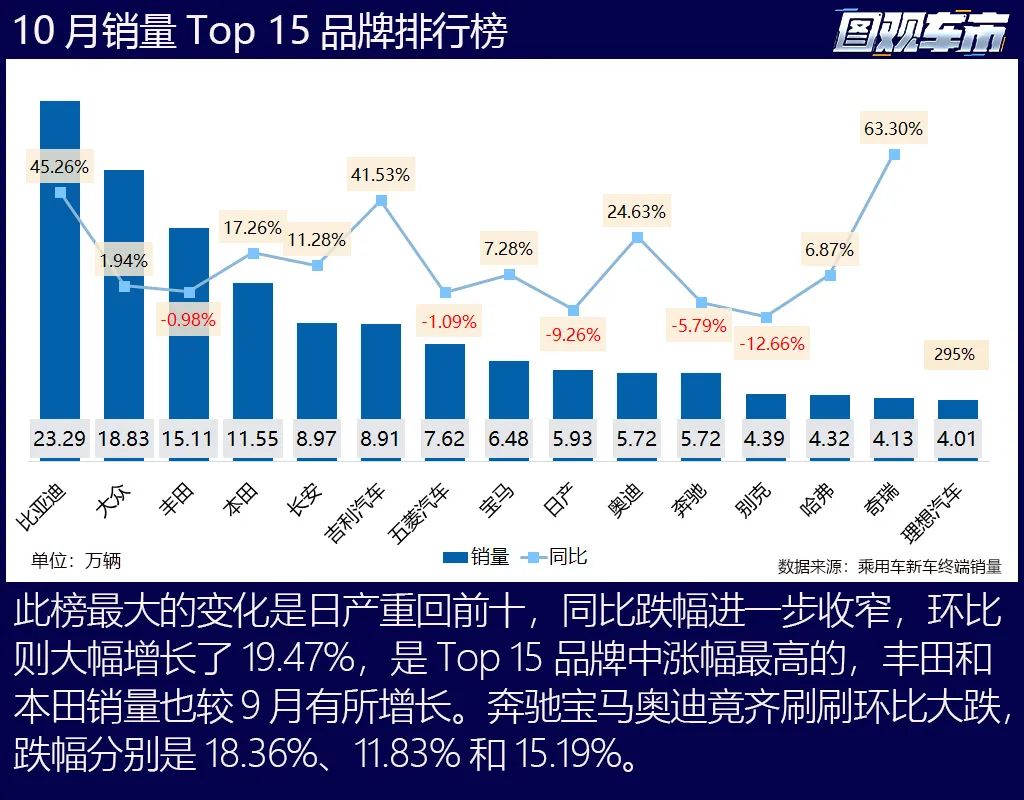 10月日系车有所复苏,丰田、本田、日产较9月销量分别增长了1.09%、8.75%和19.47%,本田同比大涨17.26%,日产同比跌幅收窄到10%以内。BBA的销量较9月齐刷刷下跌,跌幅都在10%以上。长安、吉利、哈弗、奇瑞、理想全部实现了同比、环比双增长。
