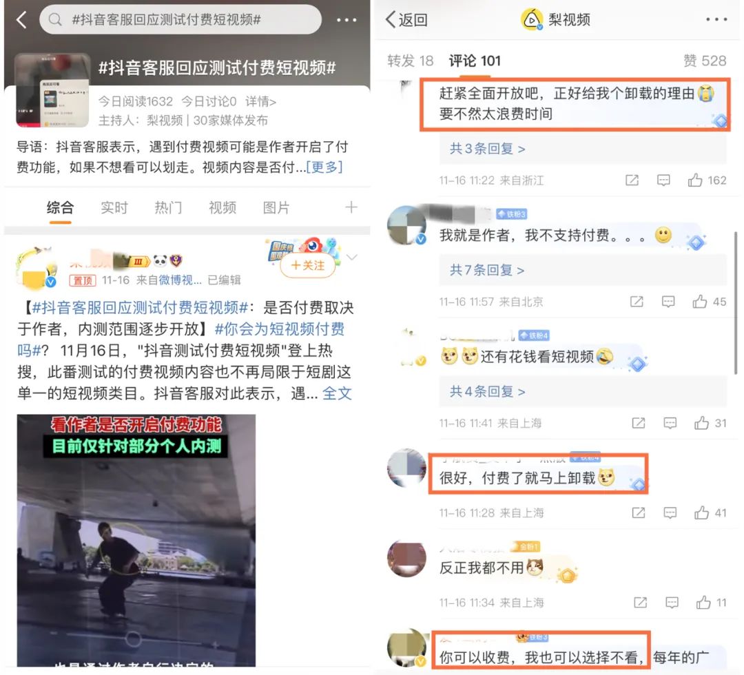 近日,“抖音内测付费短视频”的消息冲上微博热搜,引发全网热议。很多网友对付费短视频不看好,抵触心理较强。不过,也有少部分网友认为,此举将利好不擅长直播的内容创作者。