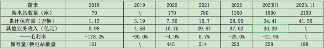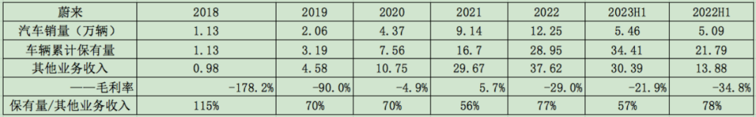 2022H1、2022、2023H1三个时间段,蔚来其他业务毛利率分别为-34.8%、-29%、-21.9%,其“保有量/其他业务收入”分别为78%、77%、57%,这反映出,尽管蔚来仍在进行补能系统的大规模资金投入,但其汽车存量的规模变化(大概30多万辆)已经能够明显提高其他业务的整体毛利率。