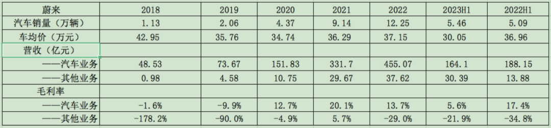 进入2022年开始,蔚来汽车业务毛利率持续降至2023H1的5.6%。