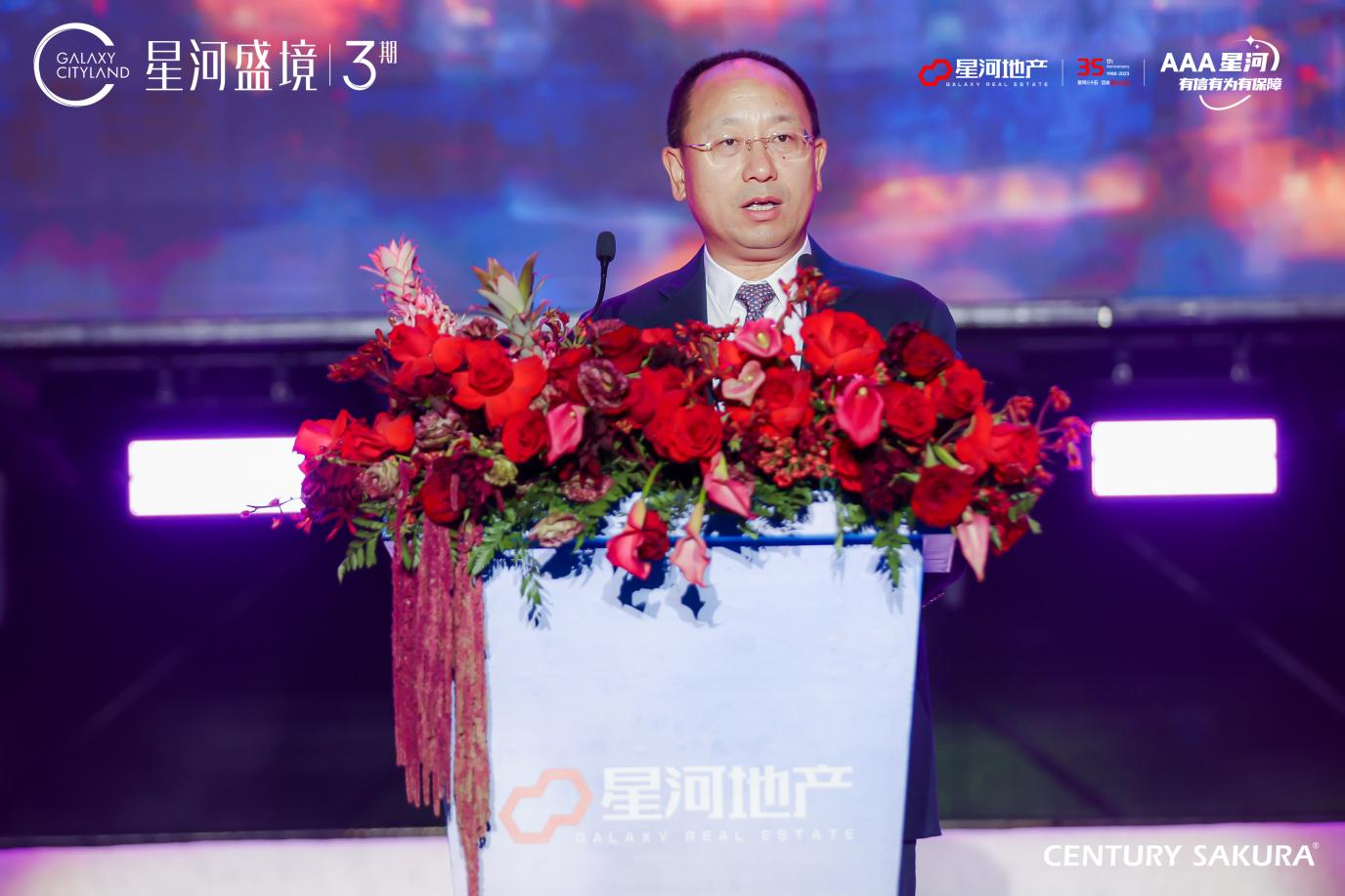 在播放完项目VCR后,星河地产集团总裁助理兼深莞惠公司常务副总裁柴文东先生登台致辞。柴总在致辞中谈到:星河35年砥砺笃行,始终“稳”字当头,连年坚守“三道红线”指标全绿,连续三年保持AAA最高主体信用评级,致力于为业主创造至臻至善的美好生活。2022年至今,两年时间内,星河地产在全国累计交付两万五千套房屋;其中,也包含了今年九月如期交付的星河盛境一期。