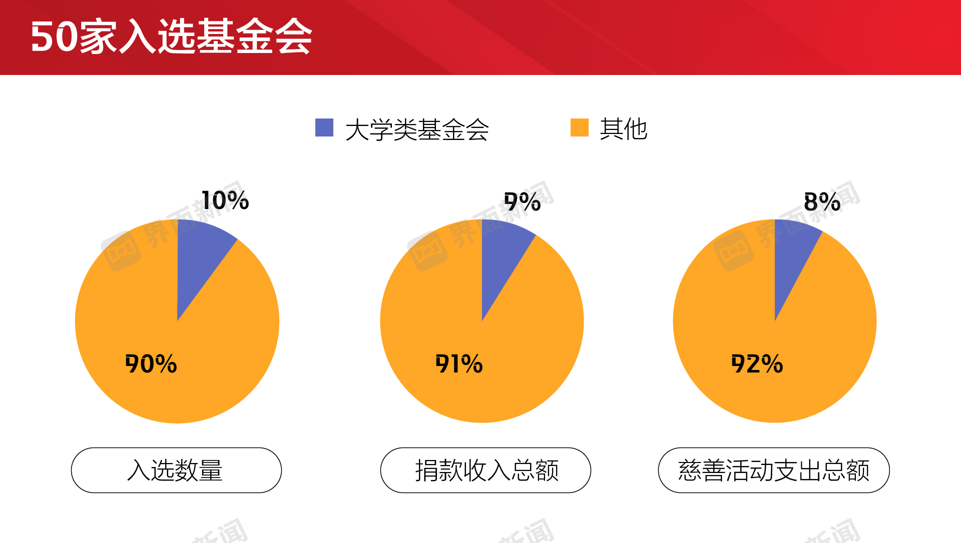 今年上榜的大学类基金会有5家,与去年相比成员稍有变化。上榜的5家大学类基金会分别是北京大学教育基金会(第18名)、西安交通大学教育基金会(第32名)、中国农业大学教育基金会(第36名)、北京市中国人民大学教育基金会(第41名)和复旦管理学奖励基金会(第44名)。其中,复旦管理学奖励基金会为今年的新成员。从财务数据来看,这5家大学类基金会全年的捐款收入总额和慈善活动支出总额分别为11亿元、11亿元,占前50家基金会捐款收入总额和慈善活动支出总额的9%、8%。