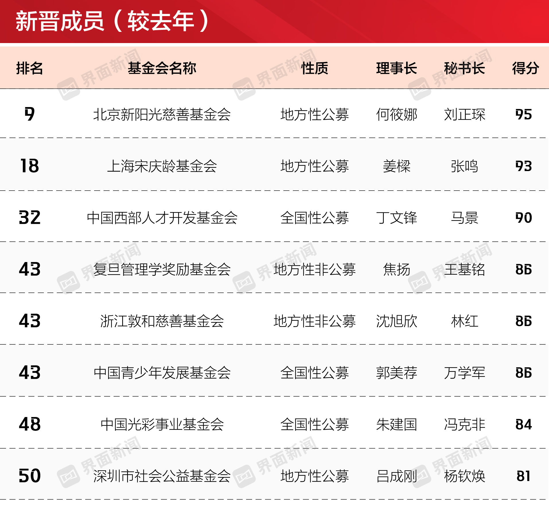 在今年的榜单上,共有50家基金会入榜,入榜者最高分为99分,入围门槛是81分,平均分为92分。中国妇女发展基金会、中国红十字基金会和中国社会福利基金会同时以99分的成绩并列第一;上海真爱梦想公益基金会、中国光华科技基金会和中国金融教育发展基金会同时获得98分,并列第二名。