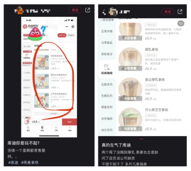 与此同时,库迪自身的供应链能力也在面临挑战,在社交媒体上,已经出现库迪多种产品轮流下架、缺货,甚至单杯打包袋也缺货被迫使用塑料袋的情况。