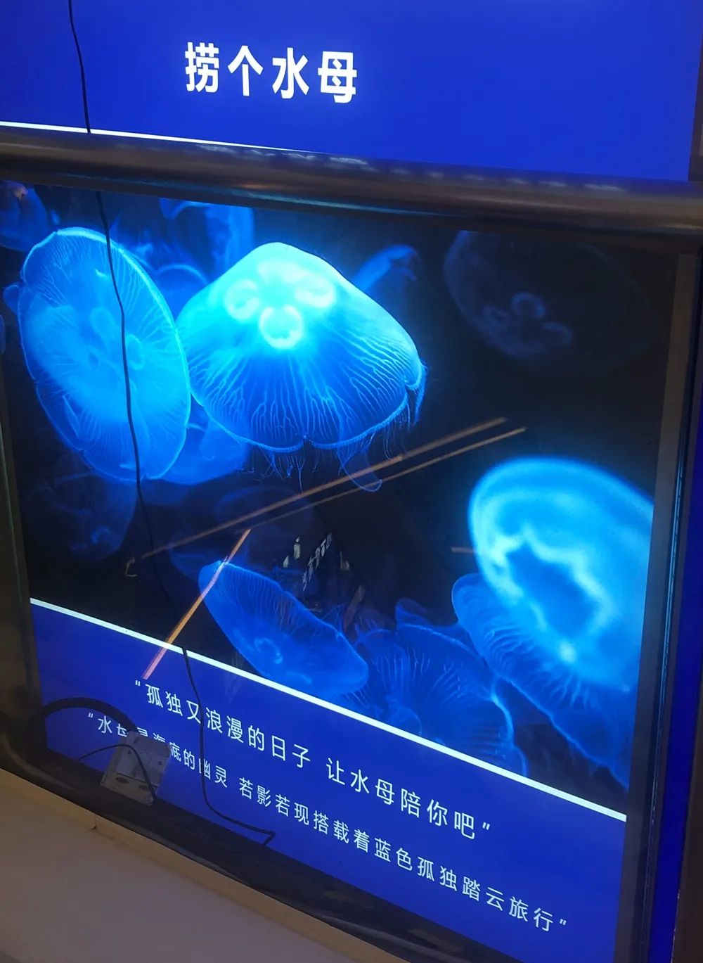 等挤在前排的消费者离开,零售君终于看到全貌。柜台上摆着几个玻璃柜,里面清一色飘着大大小小、不同品种的水母,售价30元左右。台面旁的广告牌上写着:“捞个水母——孤独又浪漫的日子,让水母陪你吧。”