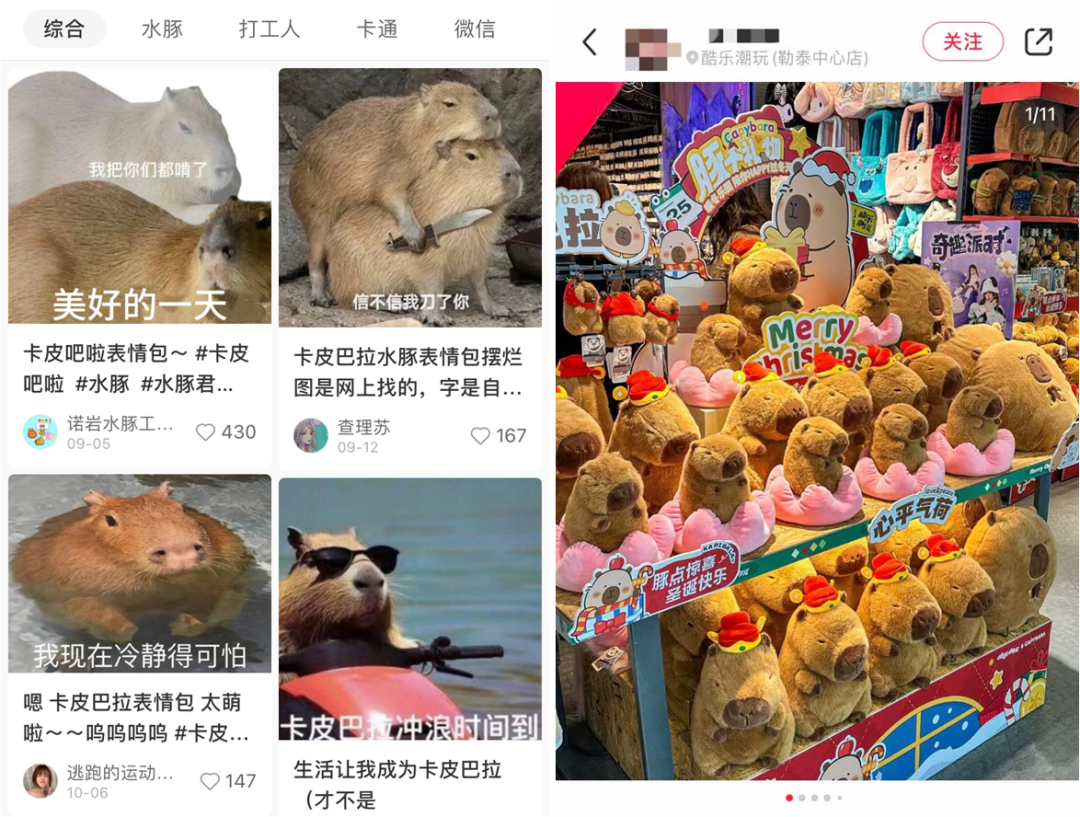 信息的广泛传播也助推了大众对小宠异宠的认知和消费欲望的增长。比如,卡皮巴拉(即水豚)因其呆萌的表情走红网络。随即,出现了卡皮巴拉形象的表情包、毛绒玩具,还有茶饮品牌推出相关联名饮品,甚至演变出“豚门”热潮,让一众年轻人为之疯狂。