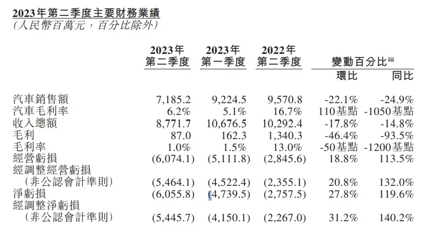 高昂的投入,随之而来的是盈利的难题。蔚来2023年第二季度业绩公告称,今年二季度,蔚来汽车营收87.717亿元,同比下降14.8%,毛利润为8700万元,同比下降93.5%,净亏损达到60.56亿元。而整个今年上半年,蔚来归母净利润仍然亏损109.26亿元。