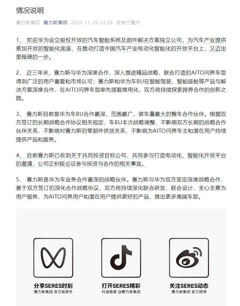 当日深夜,赛力斯集团发布《情况说明》表示,赛力斯目前是华为车BU合作最深、范围最广、装车量最大的整车合作伙伴。目前赛力斯已收到关于共同投资目标公司,共同参与打造电动化、智能化开放平台的邀请,公司正积极论证参与投资与合作的相关事宜。