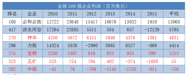 从企业年利润更能直观反映差距,必和必拓、淡水河谷、力拓三大巨头年利润均曾超过百亿美元,神华在十亿美元,其次是宝钢,五矿和中铝两家企业除了亏损达到十亿美元级别外,正盈利均落后国际巨头几个档次。