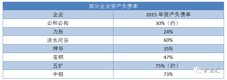 三大巨头除了淡水河谷(由2012年的37.76%攀升至2015年的59.65%)负债高垒之外,另外两家资产负债率均低于30%,国内神华和宝钢负债相对控制较好,而五矿和中铝负债率超过70%。