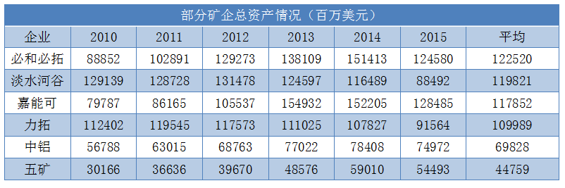 必和必拓等全球矿业巨头总资产多在千亿美元以上,而中铝和五矿总资产只有全球矿业巨头总资产的一半左右。