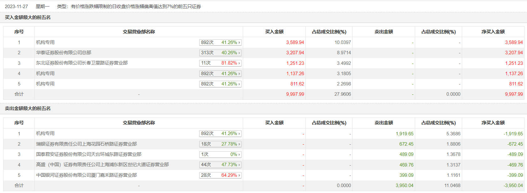 浙江仙通11月27日涨停,全天换手率达7.58%,振幅达8%。龙虎榜数据显示,营业部席位合计净买入6047.94万元。其中,机构买入5538.82万元,卖出1919.65万元,合计净买入3619.17万元。此外,华泰证券总部、东北证券长春卫星路证券营业部分别买入3207.94万元、1251.23万元;瑞银证券上海花园石桥路证券营业部、国泰君安证券天台环城东路证券营业部分别卖出672.45万元、489.09万元。