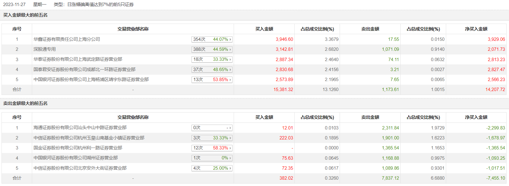 高鸿股份11月27日涨停,全天换手率达15.08%,振幅达11.37%。龙虎榜数据显示,营业部席位合计净买入6752.62万元。其中,华鑫证券上海分公司、深股通专用分别买入3946.60万元、3142.81万元;海通证券汕头中山中路证券营业部、中信证券杭州玉皇山南基金小镇证券营业部分别卖出2311.84万元、1901.00万元。
