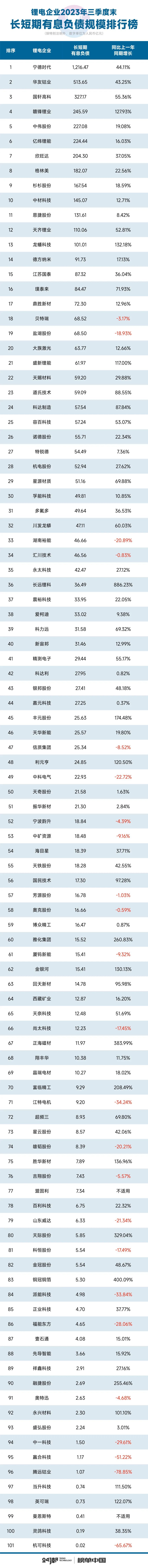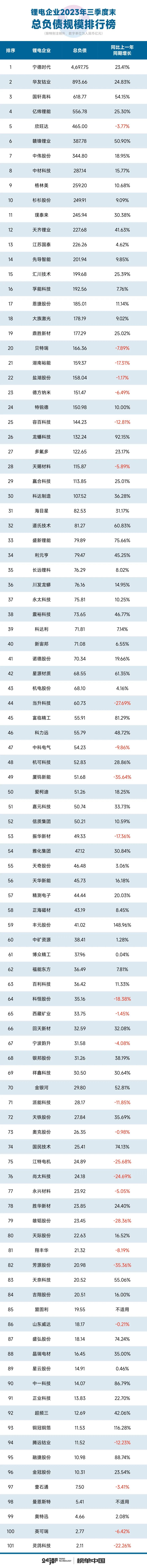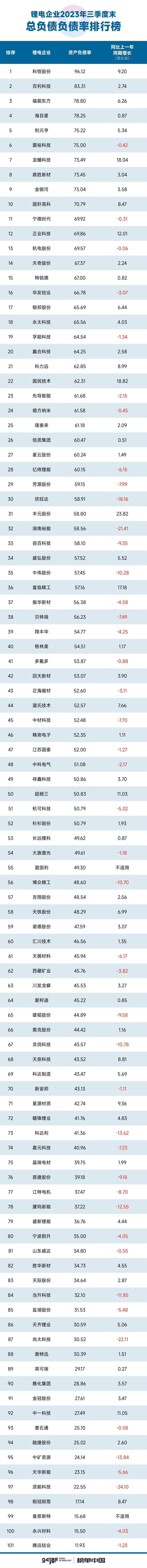 整体来看,据24潮团队统计,截止2023年9月31日,101家锂电企业总负债合计达14796.15亿元,约同比增长18.15%,整体资产负债率为56.41%,约同比下降了1.31个百分点。