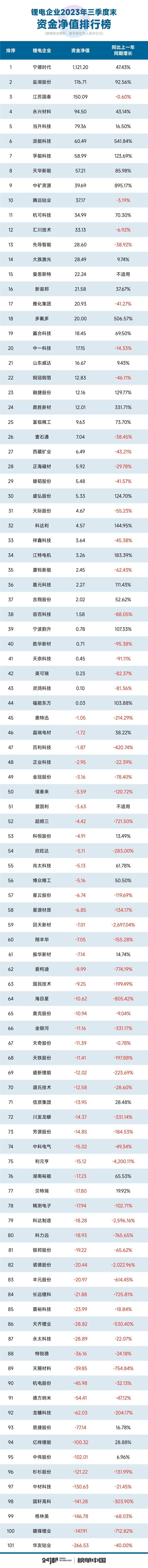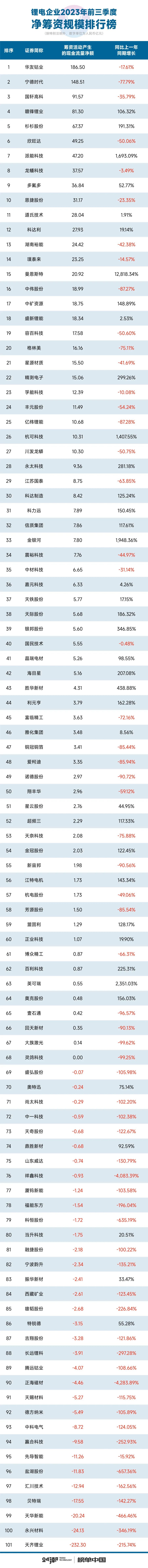 需要注意的是,当前的融资环境也并不乐观。比如据24潮统计,101家锂电企业前三季度净筹资(现金流)合计830.40亿元,同比下降了65.66%,其中Top 20企业合计净筹资991.65亿元,而多达33家企业净筹资现金流为负,即处于资金净流出状态。